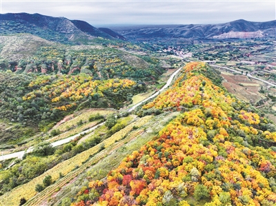 10月8日,航拍下的武乡县蟠龙镇安乐庄村层林尽染,秋意正浓。蜿蜒盘旋的公路,与红、黄、绿交织的斑斓山林相互映衬,构成一幅流动的深秋画卷。