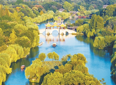 ② 10月9日,游客在江苏扬州瘦西湖风景区游玩赏秋(无人机照片)。 新华社发(周社根 摄)