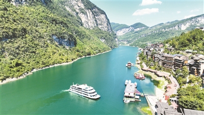 ① 10月9日拍摄的重庆市酉阳土家族苗族自治县龚滩古镇:鳞次栉比的土家吊脚楼与一江碧水、绝壁峡谷和往来船只构成一幅山水画卷(无人机照片)。 新华社发(邱洪斌 摄)