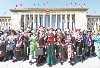 2024年3月8日,十四届全国人大二次会议第二次全体会议结束后,女代表在北京人民大会堂前合影留念。