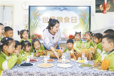 10月14日,在青岛市李沧区实验幼儿园,老师带领小朋友辨识粮食。