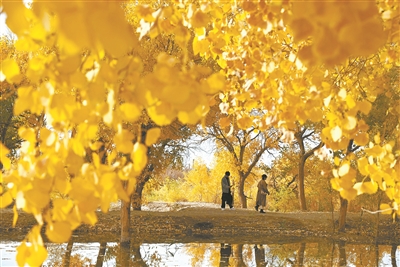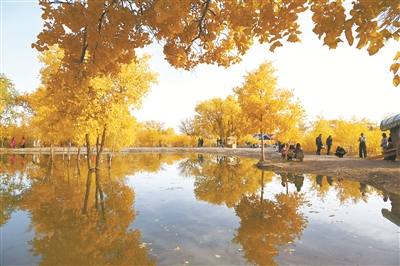 10月14日,游客在甘肃省敦煌市黄渠镇的胡杨林中游览。