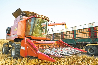 10月14日,在通辽市科尔沁区丰田镇,农机手驾驶收割机把玉米装入卡车。目前,内蒙古通辽市今年种植的近2000万亩玉米收获已过半,田间地头一派忙碌景象。