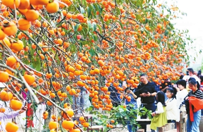 10月19日,市民和游客在四川省乐山市五通桥区汤家坝村观赏柿子树。新华社发(李华时 摄)