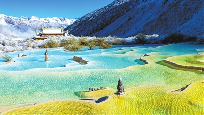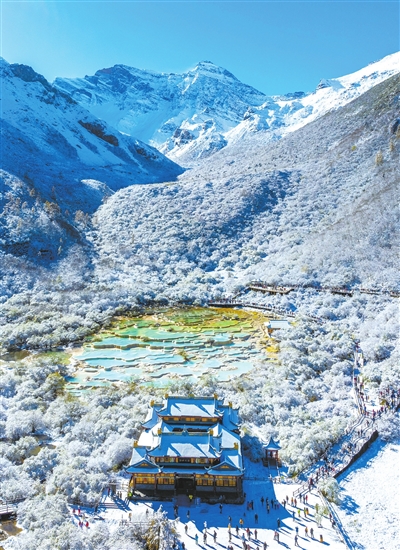 10月21日,四川省阿坝藏族羌族自治州黄龙景区迎来今秋第一场降雪,五彩池与皑皑白雪交相辉映,美不胜收。