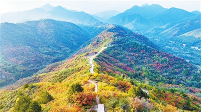 这是10月21日在山西省运城市平陆县三门镇马泉沟村拍摄的红叶美景(无人机照片)。