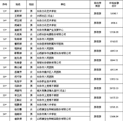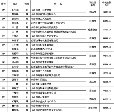 按照《长治市住房分配货币化实施方案》规定,现将长治市人民代表大会常务委员会等25个单位的离退休职工48人(其中:无房户职工24人,未达标户职工24人)申报住房补贴有关情况予以公示,接受社会监督。如了解住房补贴对象在相关方面存在问题,可自公示之日起5个工作日内向长治市城市改造和房产综合事务中心反映。