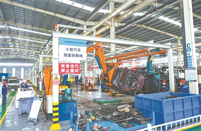 11月11日,山西瑞赛格废弃资源综合利用有限公司生产车间内,机械臂在翻转报废车辆,小型汽车报废拆解线正高效运转。近年来,该公司立足打造华北地区规模最大、装备最全、标准最高的废钢加工配送基地,目前已具备年拆解3.5万辆报废汽车能力,被工信部认定为废钢加工准入企业、国家级绿色工厂。