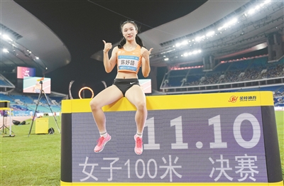 11月17日,浙江队选手陈妤颉在比赛后与成绩显示屏合影。她夺得冠军。当日,第十五届全国运动会田径女子100米决赛在广州举行。