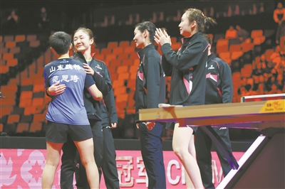 11月19日,山东队选手范思琦(左一)和队友陈梦(左二)庆祝夺冠。范思琦在女单比赛中3比2战胜河北队选手何卓佳。当日,在澳门举行的第十五届全国运动会乒乓球女子团体金牌赛中,山东队3比2战胜河北队,夺得冠军。