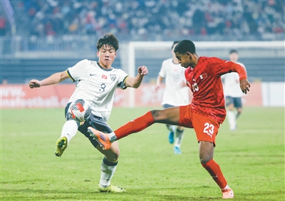 11月22日,中国队球员谢晋(前左)与巴林队球员海赛姆·沙菲(前右)在比赛中拼抢。