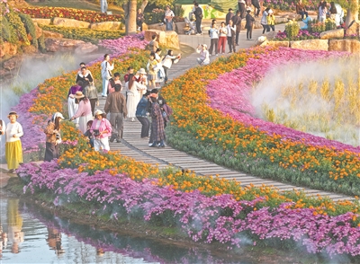 游客在广西南宁市青秀山风景区丘石花园赏花(11月26日摄,无人机照片)。连日来,广西南宁市迎来晴好天气。冬日暖阳下,南宁市青秀山风景区丘石花园内盛开的鲜花格外艳丽。