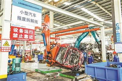 11月29日,在山西瑞赛格废弃资源综合利用有限公司,工人在拆解报废机动车。目前,该公司已具备年拆解3.5万辆报废汽车的生产能力,每天每条生产线拆解达100辆。