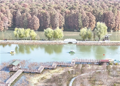 12月1日,游客在江苏省兴化市李中水上森林公园赏景游玩(无人机照片)。 新华社发 (顾继红 摄)