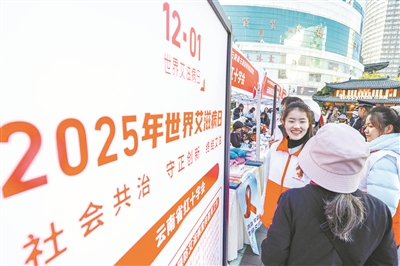 12月1日,工作人员在昆明市南屏广场举办的2025年世界艾滋病日云南省主题宣传月启动仪式上为市民普及防艾知识。