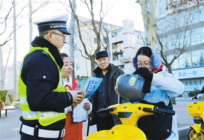 12月2日,潞州区太西街道广场西社区志愿者和交警三大队警务人员在广场西社区开展“122”交通安全宣传活动,向过往行人宣传交通安全常识。 本报记者 刘栋 摄