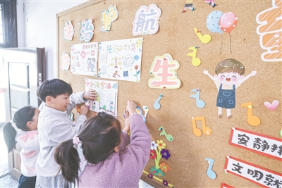 12月9日,诸暨市暨南街道中心学校王家井小学的学生把自己创作的法治宣传画贴到教室的宣传栏中。