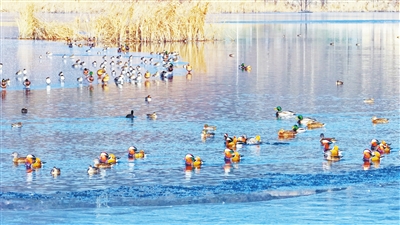 12月17日,有太行天池之称的漳泽湖国家城市湿地公园,迎来数百只国家二级保护动物鸳鸯。波光潋滟的湖面上,随处可见成群结队的鸳鸯嬉戏其中。它们结伴游弋湖面,与绿头鸭等水鸟共栖澄澈水域,斑斓的羽色为冬日湿地带来一抹生机与灵动。