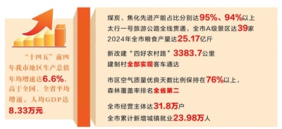 经济实力稳步提升。坚持统筹稳增长、扩内需、促转型,“十四五”前四年长治市地区生产总值年均增速达6.6%,高于全国、全省平均增速,人均GDP达8.33万元。新质生产力加快培育。加快国家创新型城市建设,省级以上科技创新平台达97家。煤炭、焦化先进产能占比分别达95%、94%以上,新兴产业初步形成了光伏、光电LED、现代医药、电子信息等14条市级产业链。太行一号旅游公路全线贯通,全市A级景区达39家,“壮美太行 久安长治”文旅品牌进一步擦亮。三农根基持续巩固。2024年全市粮食产量达25.17亿斤。潞党参口服液进入国家医保目录,长治党参栽培系统入选全球重要农业文化遗产预备名单;沁州黄小米入选全国名特优新农产品名录,成为农业农村部乡村振兴与农业品牌化标杆案例。全省特优农业高质量发展现场推进会、全省学习运用“千万工程”经验推进乡村全面振兴现场会、全省全域土地综合整治现场会在我市召开。城乡面貌持续改善。加快推进上党城镇群建设,全市常住人口城镇化率由“十三五”末的56.47%提升到60.65%。黎霍高速(黎城至沁源段)通车,实现县县通高速公路。滨湖生态新区加快建设,市博物馆、图书馆、档案馆成为长治新地标。新改建“四好农村路”3383.7公里,建制村全部实现客车通达。改革开放纵深推进。组建国运、太行建投、太行文旅、水投、农林发展公司等国资企业,推动国资布局优化。深入推进“高效办成一件事”改革,全市经营主体达31.8万户。外资外贸稳中提质,进出口总额年均增长14%。绿色发展步伐加快。坚决打好蓝天碧水净土保卫战,市区空气质量优良天数比例保持在76%以上,国控断面水质全部优良,森林覆盖率排名全省第二。大力发展新能源和清洁能源,2024年全市单位GDP能耗较“十三五”末下降14.6%。民生福祉持续增进。全市累计新增城镇就业23.98万人,城乡居民收入差距进一步缩小。“双减”试点顺利通过国家验收,建成省级区域医疗中心。连续5年被评为全省平安建设先进市,平安长治建设成效显著。