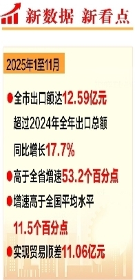 本报讯 (记者丁宇红)记者日前从市商务局获悉,2025年1至11月,全市出口额达12.59亿元,超过2024年全年出口总额,同比增长17.7%,高于全省增速53.2个百分点。这一增速高于全国平均水平11.5个百分点,并实现贸易顺差11.06亿元,展现出我市外向型经济发展的强劲韧性与活力。