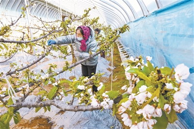 1月18日,上党区白家沟村绿色智慧樱桃大棚内,农户在忙着疏花、授粉。近年来,该村通过大力发展现代设施农业樱桃种植项目,为当地经济发展注入了新活力。
