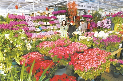 随着春节临近,我市各大花卉市场迎来销售旺季,各类花卉竞相绽放,绿植葱茏悦目,融入马年元素的创意花卉尤为引人注目,吸引了众多市民前来选购。图为2月7日,市民在潞州区鹿家庄花卉市场选购。