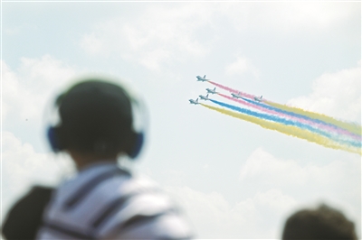 2月7日,在新加坡樟宜展览中心,观众观看中国空军八一飞行表演队的飞行表演。
