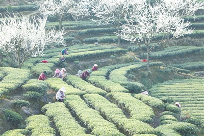 2月26日,茶农在四川省眉山市洪雅县止戈镇青杠坪村万亩生态茶园采摘春茶。