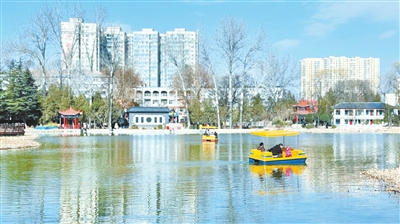 2月25日,天气晴好,市人民公园内,湖面波光粼粼,市民泛舟湖上、赏景休闲,尽享春日美好时光。