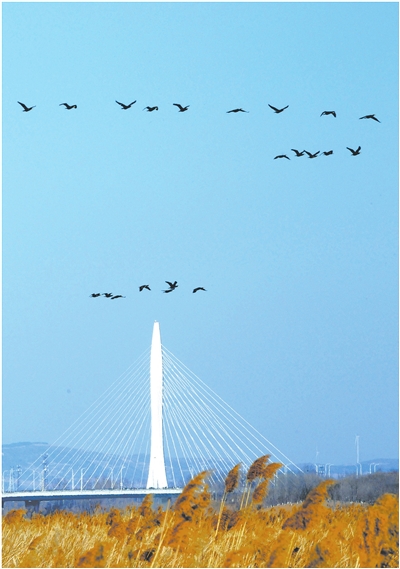 2月27日,漳泽湖国家城市湿地公园冰面渐融、春水初暖,成群候鸟追逐嬉戏、展翅飞翔,勾勒出人与自然和谐共生的生态美景。 本报记者 李阳鸿 摄