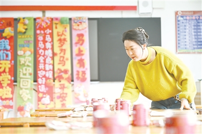 2月27日,老师在贵州省开阳县第一小学布置教室。