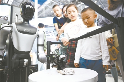 9月21日,小朋友在2025世界制造业大会智能机器人展区参观一款会擦桌子的机器人。