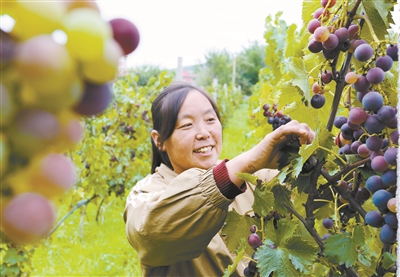 9月28日,壶关县龙泉镇西川底村村民张云峰在采摘葡萄。近年来,该村大力发展葡萄种植,有效促进农民增收。