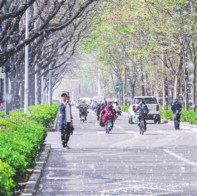4月16日,我市主城区再现“春日飞雪”奇观。飞絮随风盘旋,如鹅毛般铺满道路,阳光下泛起朦胧银光,引得市民纷纷举起手机记录这浪漫景象。然而,纷扬的絮团也给市民带来了困扰:行人掩面疾走,过敏者戴紧口罩,路边商铺频频清扫门槛积絮。对此,环卫部门加密喷雾降絮作业,并通过社区提醒居民关窗防护、注意防火。这场自然馈赠的“白色盛宴”,在诗意与现实的碰撞中,悄然诉说着北方春天的独特印记。 本报记者 司敏 摄