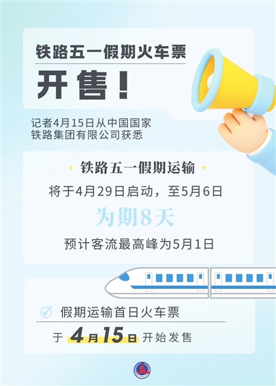记者4月15日从中国国家铁路集团有限公司获悉,铁路五一假期运输将于4月29日启动,至5月6日,为期8天,预计客流最高峰为5月1日。假期运输首日火车票于4月15日开始发售。新华社发 施鳗珂 编制
