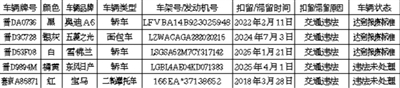 根据《中华人民共和国道路交通安全法》第一百一十二条、《中华人民共和国道路交通安全法实施条例》第一百零七条、《道路交通事故处理程序规定》(公安部第146号令)第五十八条之规定,下列5辆因交通违法或交通事故被长治市公安局交通警察支队一大队依法扣留的车辆,驾驶人、所有人或管理人应自此公告发布之日3个月内,持公安机关交通管理部门强制措施凭证及其他相关手续到扣留车辆的交警大队接受处理,逾期不来接受处理的,公安机关交通管理部门将对扣留的车辆依法处理。