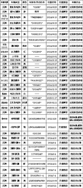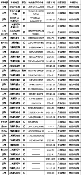 根据《中华人民共和国道路交通安全法》第一百一十二条、《中华人民共和国道路交通安全法实施条例》第一百零七条、《道路交通事故处理程序规定》(公安部146号令)第五十八条之规定,下列71辆因交通违法或交通事故被襄垣县公安局交警大队依法扣留的车辆,驾驶人、所有人或管理人应自此公告发布之日起3个月内,持公安机关交通管理部门强制措施凭证及其他相关手续,到襄垣县公安局交警大队接受处理,逾期不来接受处理的,公安机关交通管理部门将对扣留的车辆依法处理。