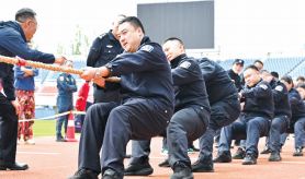 “起绳、正绳、预备……”拔河场地上,随着裁判一声哨响,选手们两脚蹬地、紧握长绳、重心后仰,动作一气呵成,爆发出浑身力量,与对手展开角力。场边的啦啦队挥动双臂,有节奏地高喊口号,加油声、助威声、呐喊声此起彼伏。比赛现场高潮迭起、扣人心弦,激烈的竞赛氛围一浪胜过一浪。
