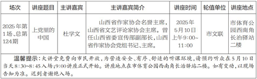 本报讯 记者马嫣婕报道:由市委宣传部主办,市文联轮值承办的2025年第1场、总第124期上党文化大讲堂将于5月10日上午9时准时开讲。本期讲座邀请山西省作家协会名誉主席杜学文,围绕“上党里的中国”主题进行专场讲座。