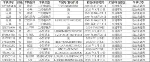 根据《中华人民共和国道路交通安全法》第一百一十二条、《中华人民共和国道路交通安全法实施条例》第一百零七条、《道路交通事故处理程序规定》(公安部第146号令)第五十八条之规定,下列16辆因交通违法或交通事故被长治市公安局交通警察支队三大队依法扣留的车辆,驾驶人、所有人或管理人应自此公告发布之日3个月内,持公安机关交通管理部门强制措施凭证及其他相关手续到扣留车辆的交警大队接受处理,逾期不来接受处理的,公安机关交通管理部门将对扣留的车辆依法处理。