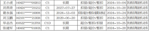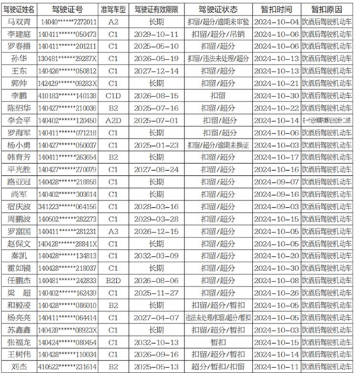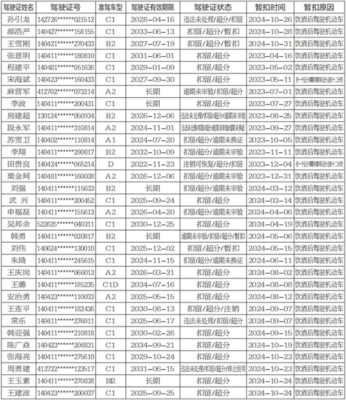 以下67名机动车驾驶人在一个记分周期内累积记分满12分,收到满分教育通知书后三十日内拒不参加公安机关交通管理部门通知的满分学习、考试或经考试仍不合格的,根据《中华人民共和国道路交通安全法实施条例》第二十三条、第二十五条和《道路交通安全违法行为记分管理办法》(公安部163号令)第二十九条之规定,自本公告发布之日起,长治市公安局交通警察支队将公告其机动车驾驶证停止使用。