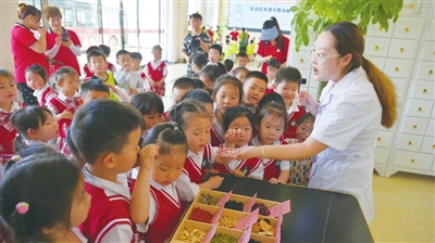 活动中,孩子们认识了多位“中药朋友”,像小木棍一样的黄芪、白白胖胖的党参、形似小灯笼的连翘。老师用童趣的语言解释:“党参是能量补给站,连翘能帮忙赶走感冒病菌……”