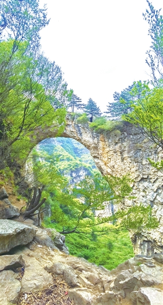 过桥是为了到另一头的桥下,这样才有机会从正面近观这座天生桥的全部。它飞跨于南北两座危崖之间,厚约6米,跨度约50米,最大高度约150米,号称北方最大的天生桥。再往地下看,桥似乎又是从脚下的乱石草丛中生长而出,亘古万年地屹立在那里,等待着有缘人的到来。