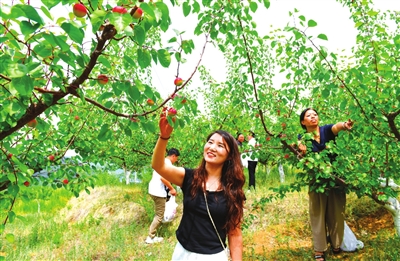 6月23日,游客们在上党区南宋镇东掌村采摘梅杏。