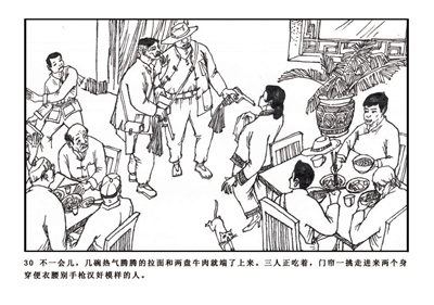 30.不一会儿,几碗热气腾腾的拉面和两盘牛肉就端了上来。三人正吃着,门帘一挑走进来两个身穿便衣汉奸模样的人。