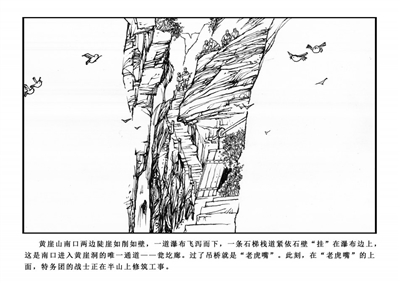 37.黄崖山南口两边陡崖如削如壁,一道瀑布飞泻而下,一条石梯栈道紧依石壁“挂”在瀑布边上,这是南口进入黄崖洞的唯一通道——瓮圪廊。过了吊桥就是“老虎嘴”。此刻,在“老虎嘴”的上面,特务团的战士正在半山上修筑工事。