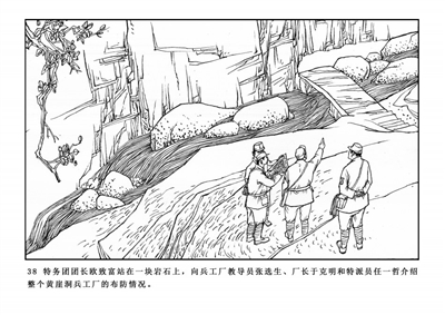 38.特务团团长欧致富站在一块岩石上,向兵工厂教导员张选生、厂长于克明和特派员任一哲介绍整个黄崖洞兵工厂的布防情况。