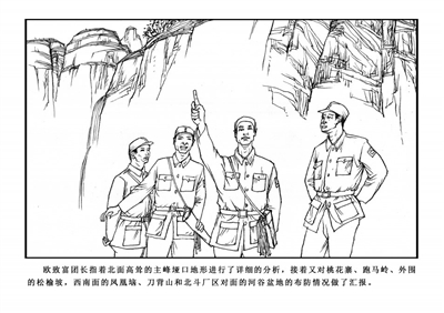 39.欧致富团长指着北面高耸的主峰垭口地形进行了详细的分析,接着又对桃花寨、跑马岭、外围的松榆坡,西南面的凤凰垴、刀背山和北斗厂区对面的河谷盆地布防情况作了汇报。