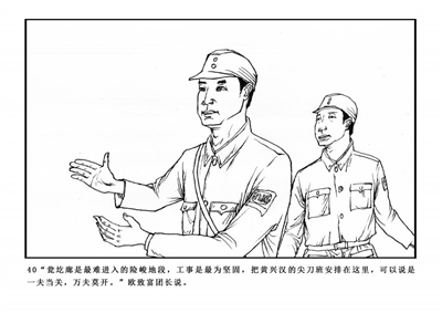 40.“瓮圪廊是最难进入的险峻地段,工事最为坚固,把黄兴汉的尖刀班安排在这里,可以说是一夫当关,万夫莫开。”欧致富团长说。