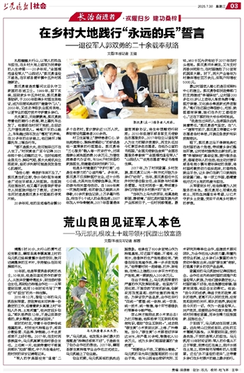 夕阳西下,马元凯站在田埂上眺望。远处荒山已变成良田,近处的玉米穗随风摇曳。从军营到田垄,变的是战场,不变的是军人的担当。马元凯用10年时间证明:军人的价值从不止于军营,把责任扛在肩上,把汗水洒在土地上,同样能书写精彩的人生篇章。这位“永不退役的老兵”,正带着乡亲们在乡村振兴的路上稳步前行。